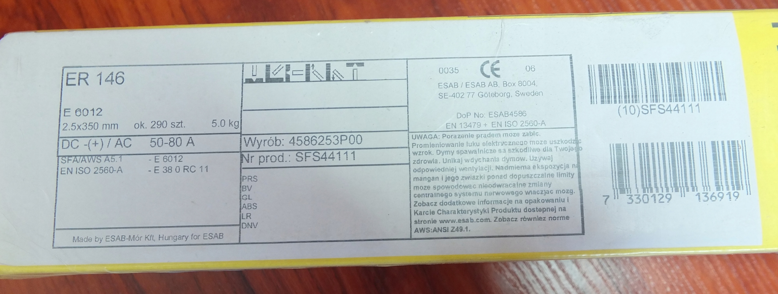Elektrody Rutylowe, ESAB ER 146, MMA, E 6012, Ø2,5; 5kg; L=350mm; około 290szt; 50-80A;
